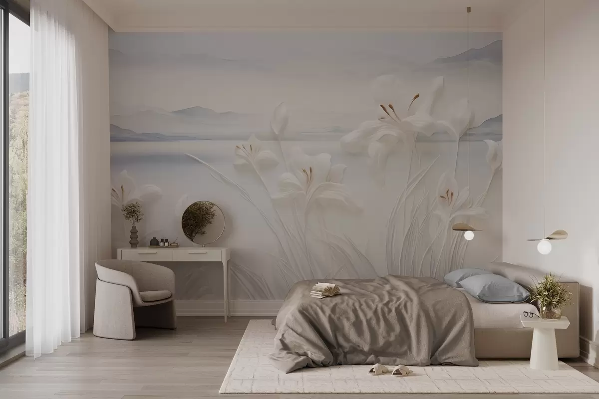 Фотошпалери Білі лілії з довгими стеблами і листям, гори і озеро на задньому плані, мінімалістична пейзажна композиція w09206