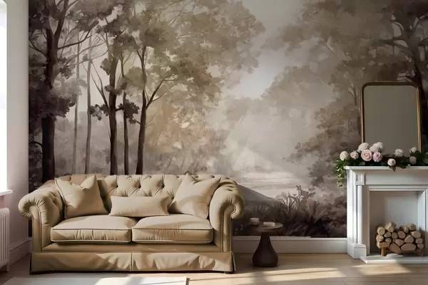 Фотошпалери Текстурований лісовий пейзаж, дерева з бежевим і коричневим листям, пастельна палітра кольорів w09210
