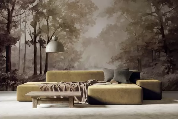 Шпалери Текстурований лісовий пейзаж, дерева з бежевим і коричневим листям, пастельна палітра кольорів w09210
