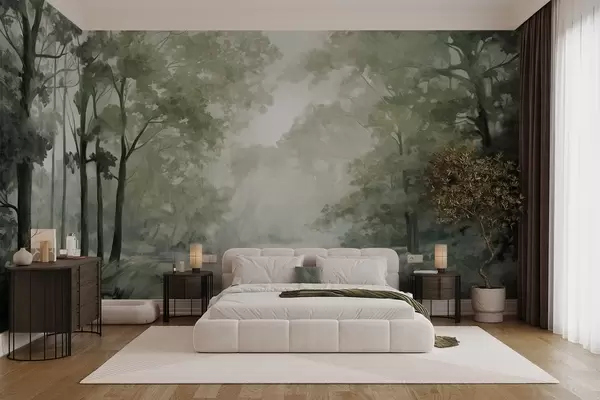 Фотошпалери Текстурований лісовий пейзаж, дерева з зеленим листям, пастельна палітра кольорів w09210v2