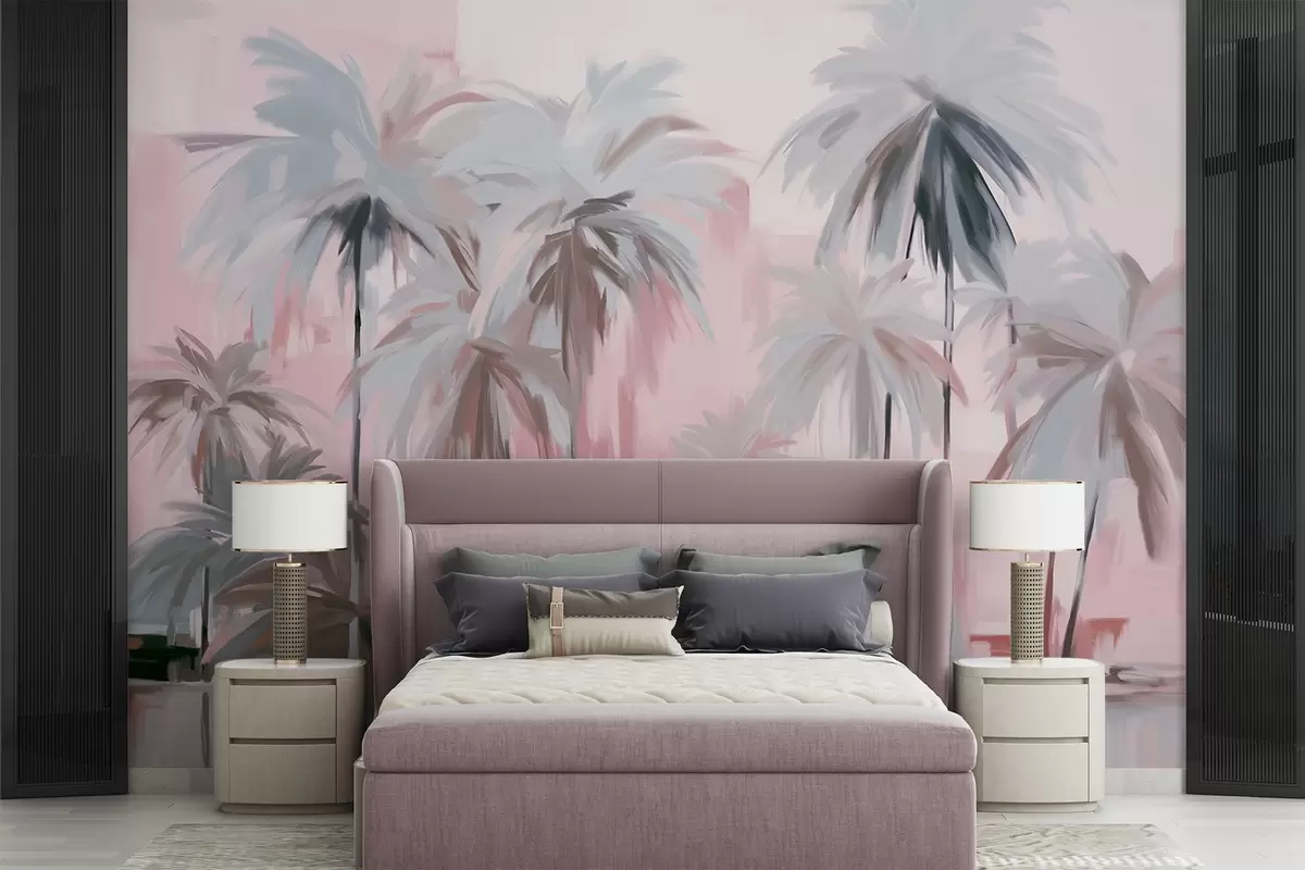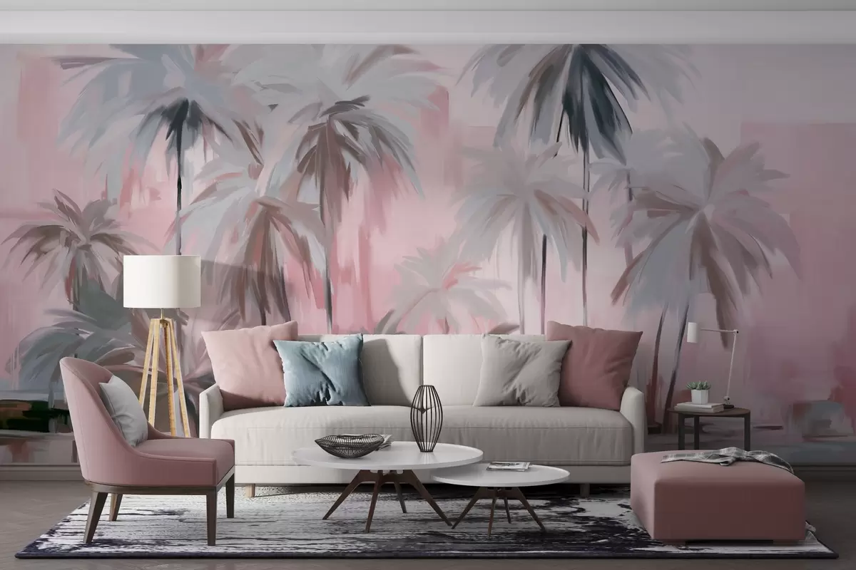 Фотошпалери Абстрактні мінімалістичні пастельні тропічні пальми на тлі приглушених рожевих і сірих відтінків w09212v1