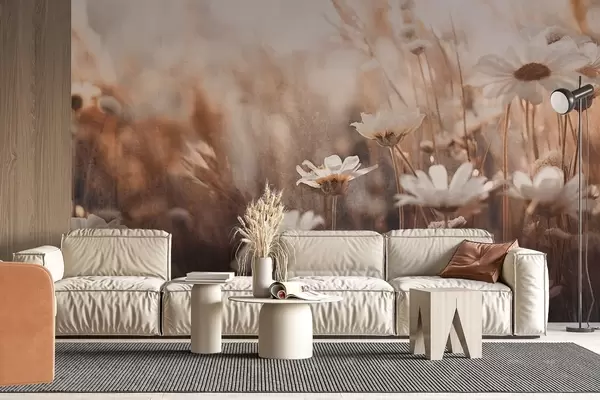 Шпалери Текстуроване поле з білих ромашок і польових квітів у теплій палітрі з розмитим фоном w09214