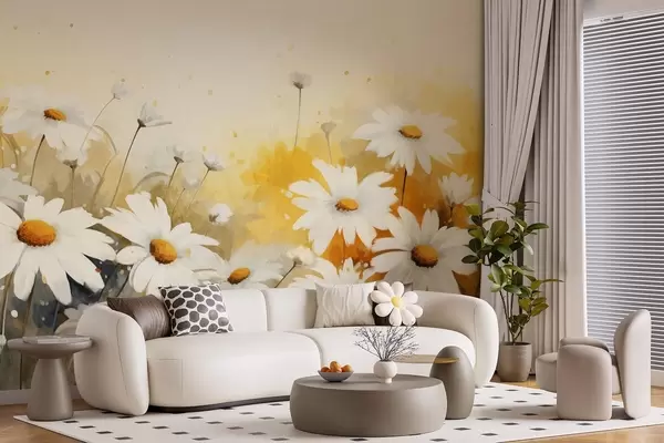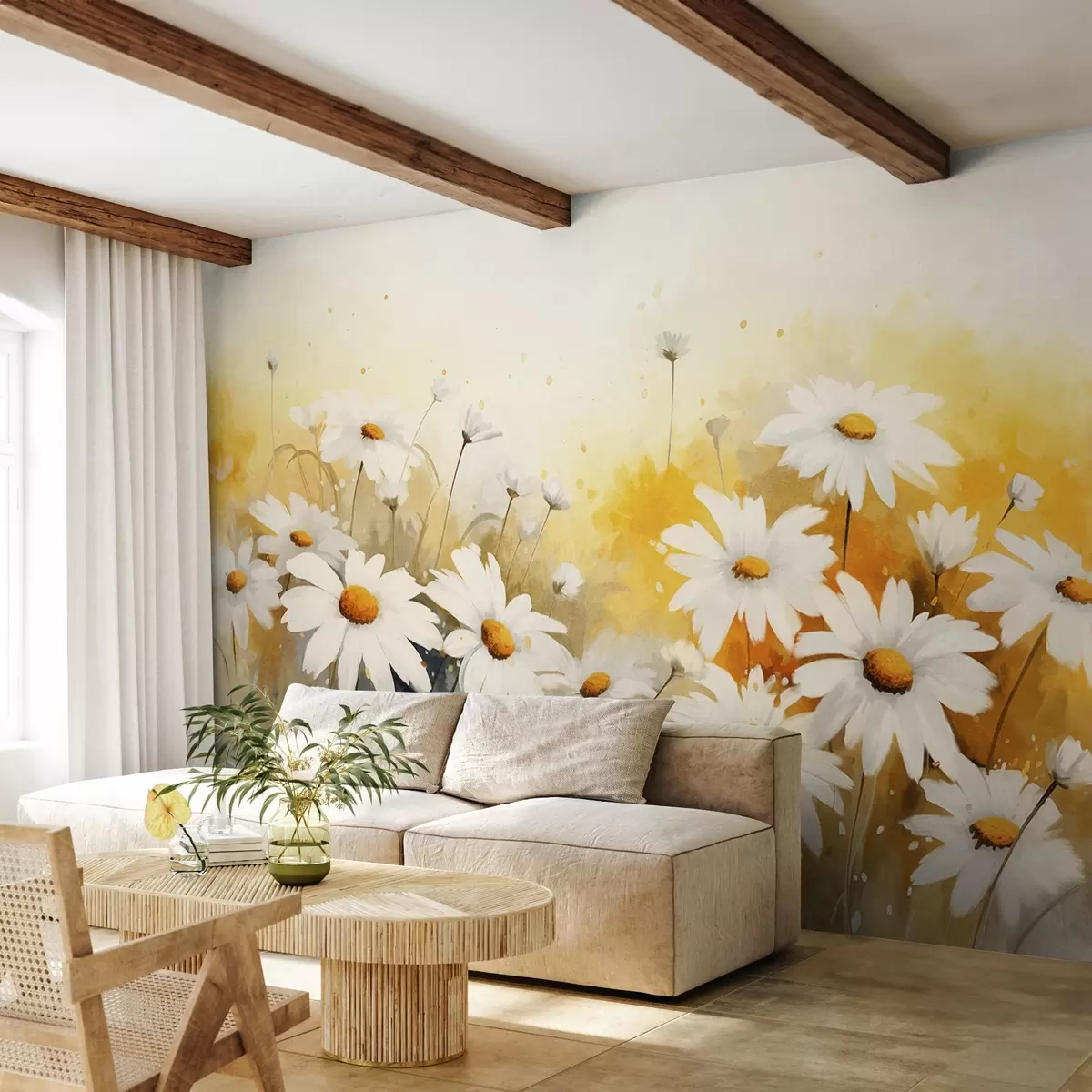 Фотошпалери Поле білих ромашок з жовтими серединками, на м'якому жовто-бежевому тлі, акварельний стиль w09218