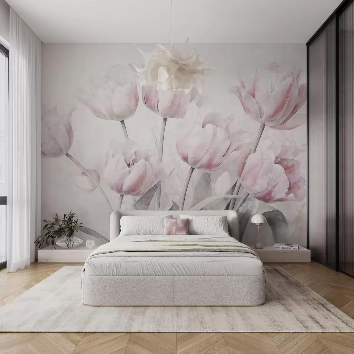 Фотошпалери Рожеві фактурні тюльпани з зеленим листям, м'яке світло, вінтажна акварель, ніжні мазки w09220
