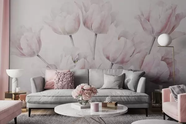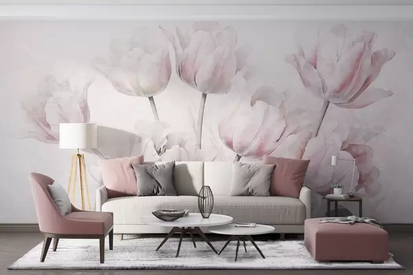Фотошпалери Рожеві фактурні тюльпани з зеленим листям, м'яке світло, вінтажна акварель, ніжні мазки w09220