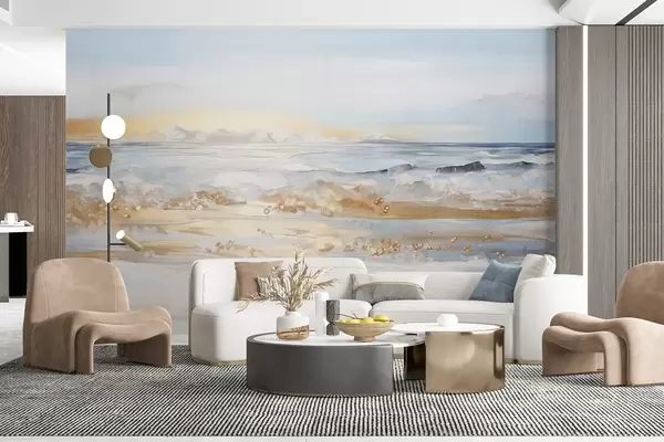Фотошпалери Абстрактний фактурний пейзаж океанські хвилі, що розбиваються об піщаний пляж, м'які пастельні кольори, блакитне небо з легкими хмаринками w09234