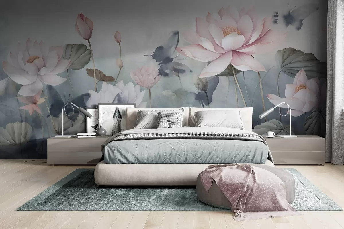 Фотошпалери Текстуровані квіти лотоса з рожевими пастельними пелюстками, зеленим листям, віддзеркаленням води, м'якими пастельними кольорами, ефектом акварелі w09254