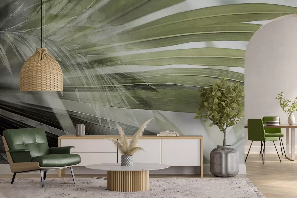 Фотошпалери Пальмове листя світло-зеленого відтінку, що накладається і створює ефект багатошаровості, на м'якому, нейтральному тлі w09256v1