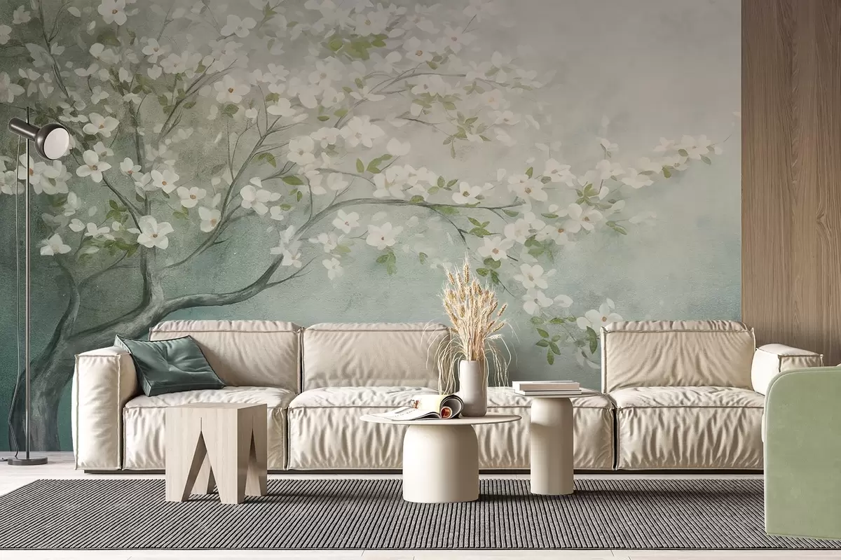Шпалери Квітуче дерево з білими квітами в повному розквіті, на зернистому шумному фактурному тлі приглушеного синього і зеленого w09261