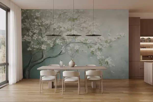 Фотошпалери Квітуче дерево з білими квітами в повному розквіті, на зернистому шумному фактурному тлі приглушеного синього і зеленого w09261