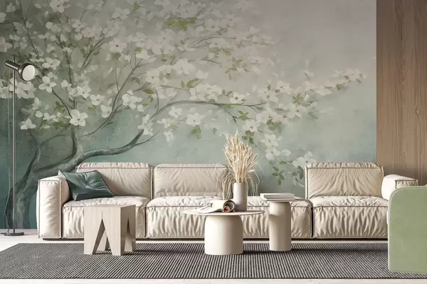 Фотошпалери Квітуче дерево з білими квітами в повному розквіті, на зернистому шумному фактурному тлі приглушеного синього і зеленого w09261