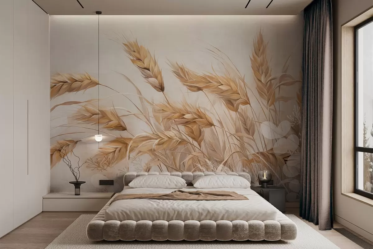 Фотошпалери Пшеничне текстуроване поле з бежевими колосками, що колишуться на вітрі, м'які та приглушені кольори, що створюють відчуття тепла w09264