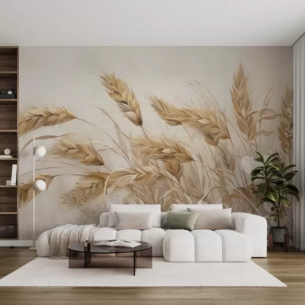 Фотошпалери Пшеничне текстуроване поле з бежевими колосками, що колишуться на вітрі, м'які та приглушені кольори, що створюють відчуття тепла w09264