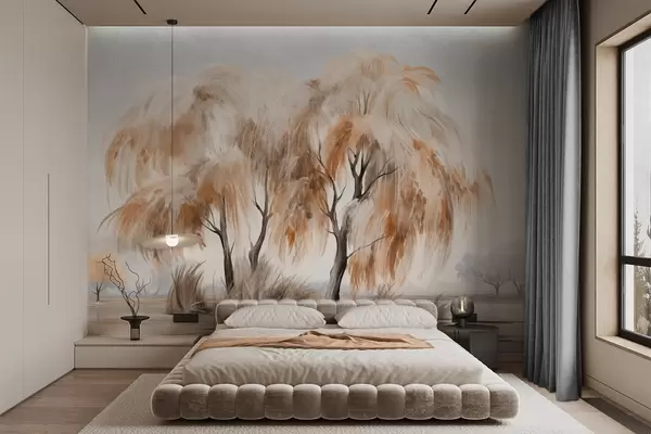 Фотошпалери Текстуровані верби з коричневим і білим листям на березі озера, з травою навколо, в туманний день w09268