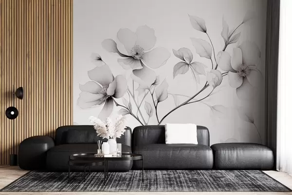Фотошпалери Чорно-білі квіти з елегантними лініями на сірому тлі w09271