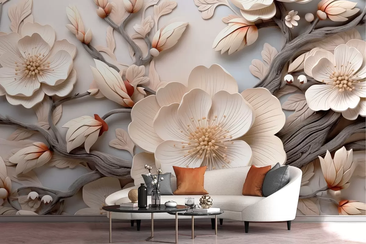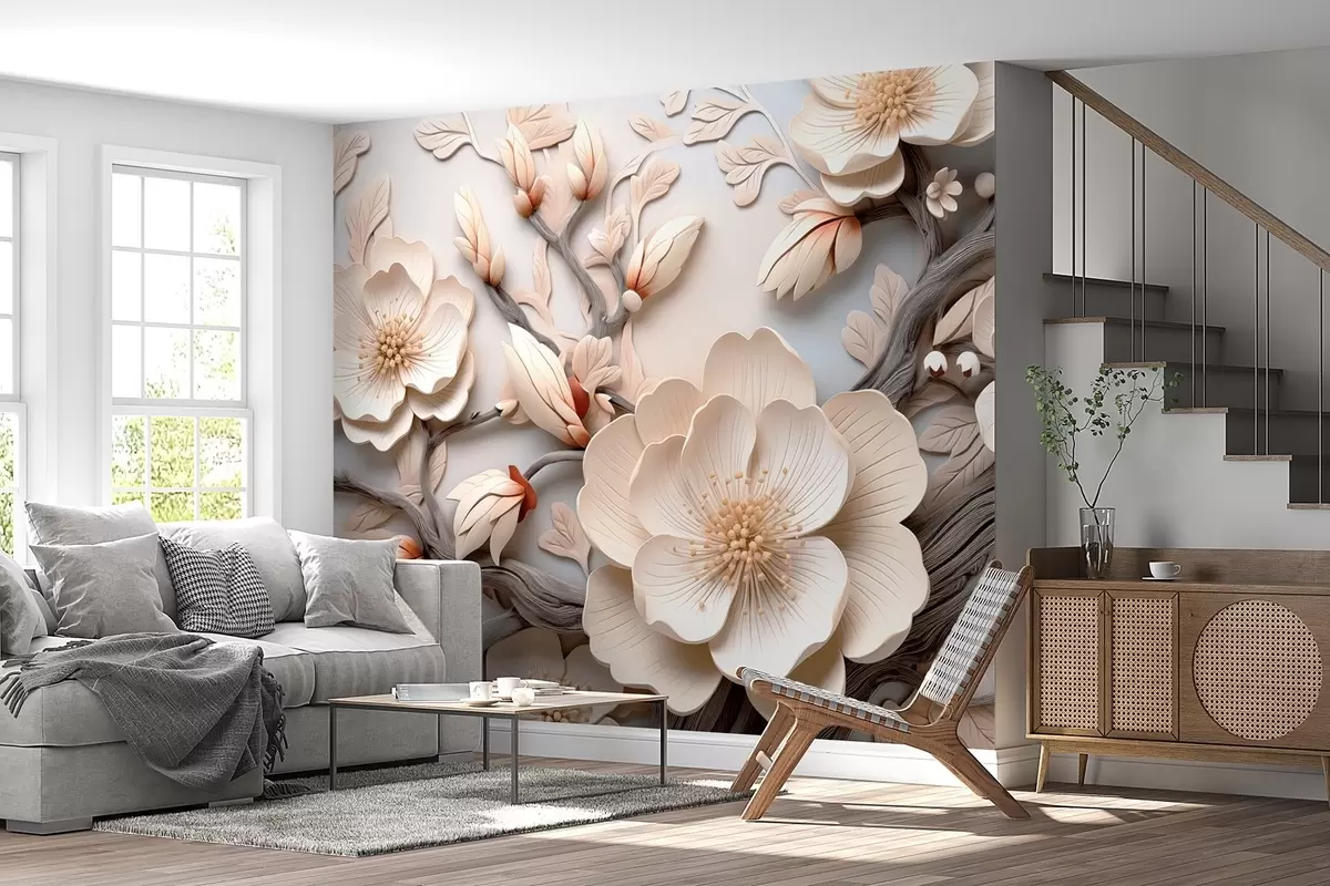 Фотошпалери Об'ємні квіти та гілки у світлих тонах w09272