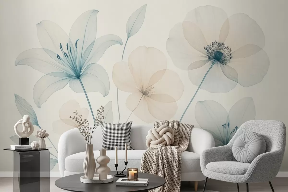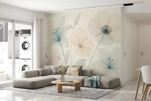 Фотошпалери Ніжні квіти в пастельно-блакитному та кремовому акварельному стилі w09287