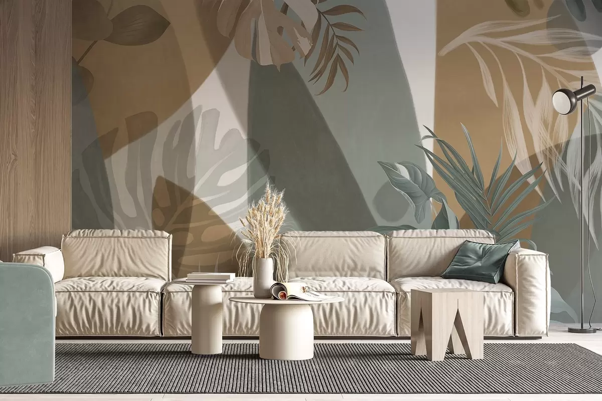 Фотошпалери Листя монстери і пальмове листя в візерунку з коричневими, білими і зеленими кольорами, тропічна атмосфера, абстрактні форми, декоративні w09288