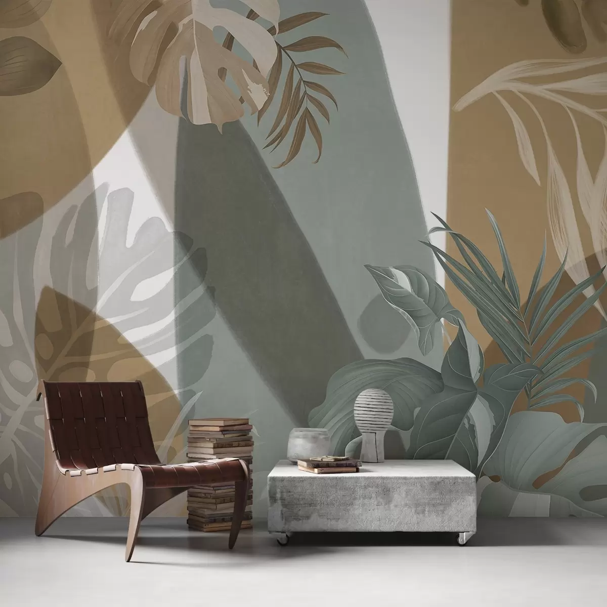 Фотошпалери Листя монстери і пальмове листя в візерунку з коричневими, білими і зеленими кольорами, тропічна атмосфера, абстрактні форми, декоративні w09288