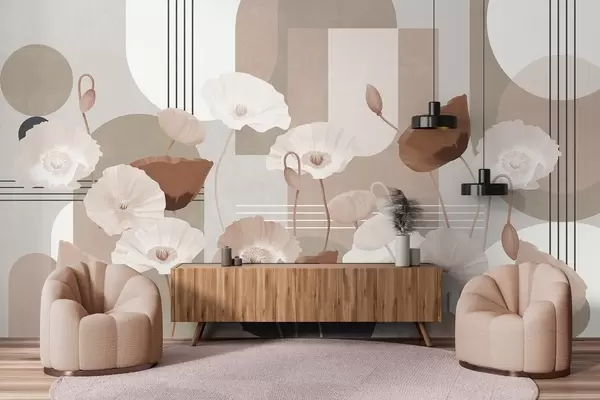 Фотошпалери Маки в білому та бежевому кольорах з геометричними фігурами на задньому плані, колами та арками, мінімалістичний стиль, м'які кольори w09289