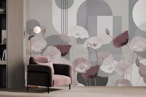 Фотошпалери Маки в біло-сірих кольорах з геометричними фігурами на задньому плані, колами та арками, мінімалістичний стиль, м'які кольори w09289v1