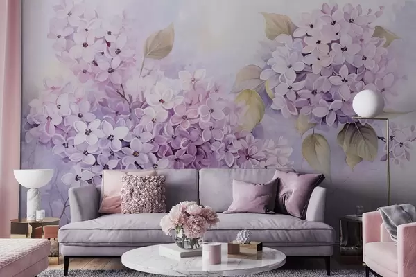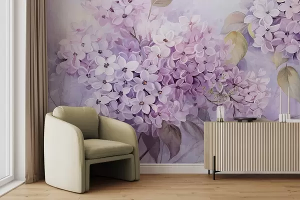 Шпалери Бузкові фактурні квіти зі світло-фіолетовими пелюстками, світло-зелене листя, акварельний стиль, м'які, пастельні кольори, ніжні мазки w09291
