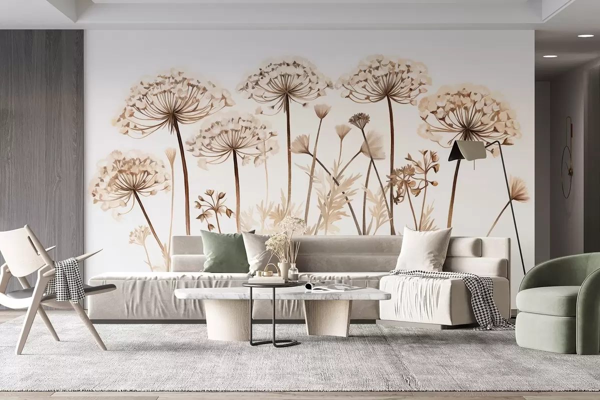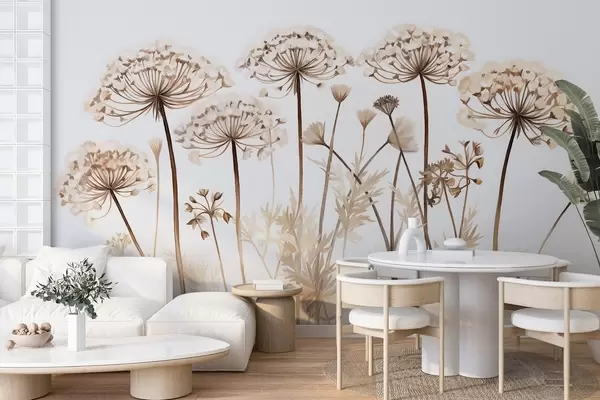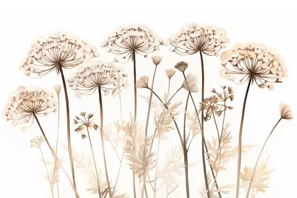 Фотошпалери Мереживо королеви Анни квіти в полі, фактурна імітація живопису, коричнева, бежева та біла палітра кольорів, ботанічна ілюстрація w09294