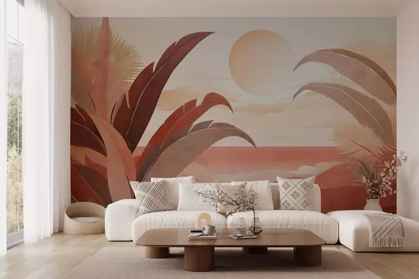 Фотошпалери Тропічний фактурний абстрактний пейзаж з пальмовим листям і великим сонцем у небі, тепла кольорова палітра, мінімалістичний стиль, стилізований w09296