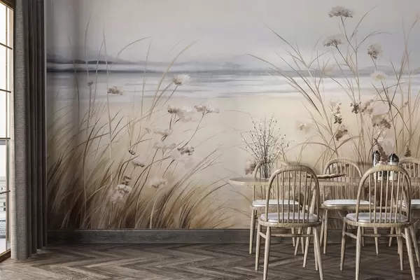 Фотошпалери Поле пшениці з білими квітами на передньому плані, пляж і океан на задньому плані, нейтральні пастельні приглушені кольори w09298