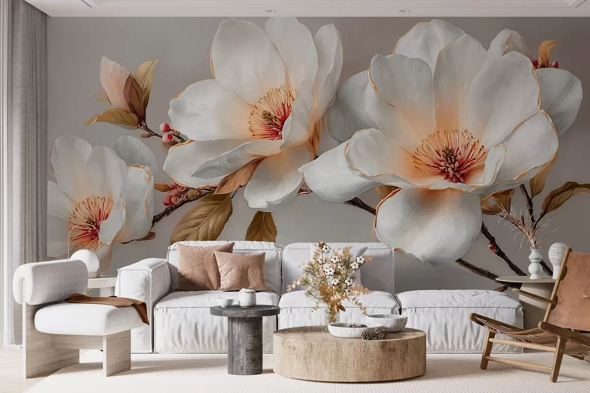 Фотошпалери Ніжні квіти на гілці в пастельних тонах з помаранчевими серединками w09299