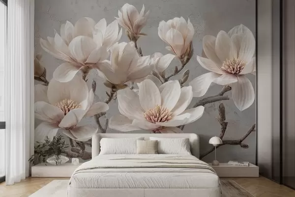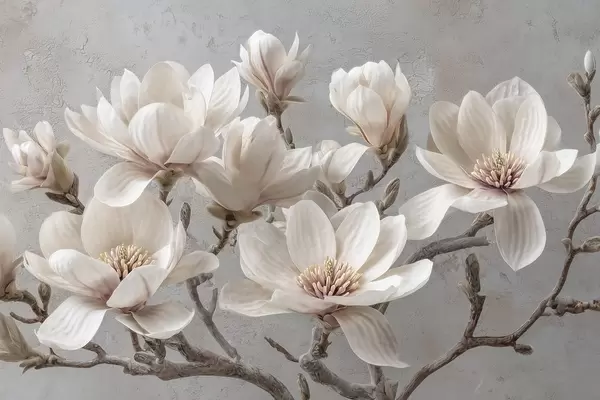 Фотошпалери Гілки магнолії з великими світлими квітами в приглушених тонах w09305