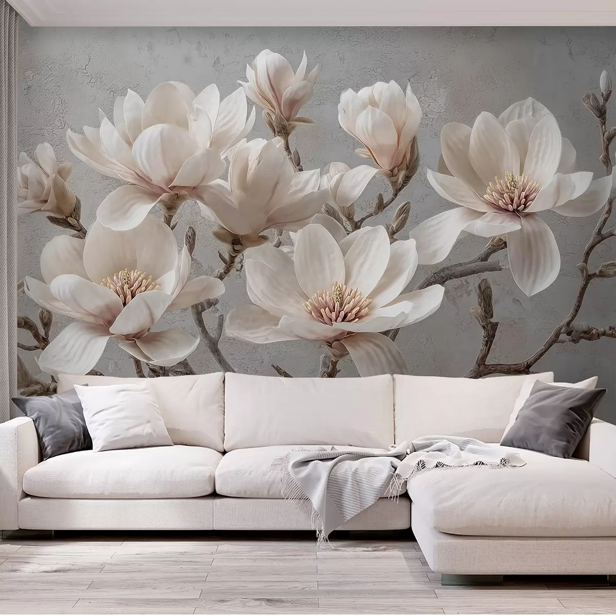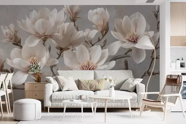 Фотошпалери Гілки магнолії з великими світлими квітами в приглушених тонах w09305