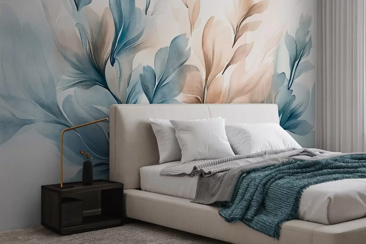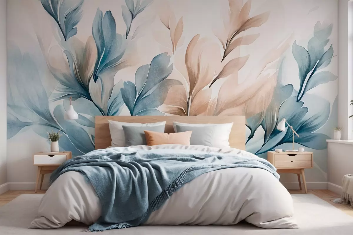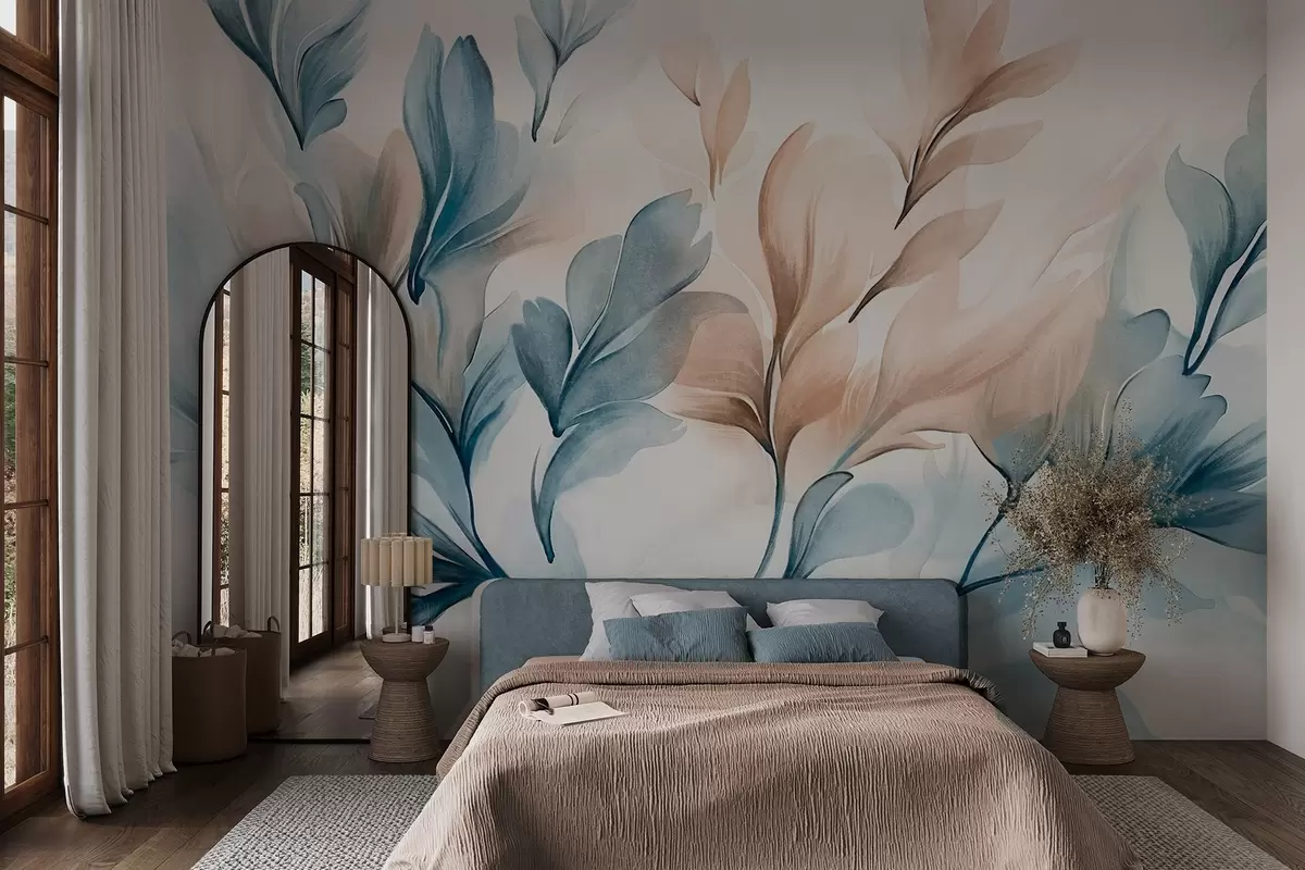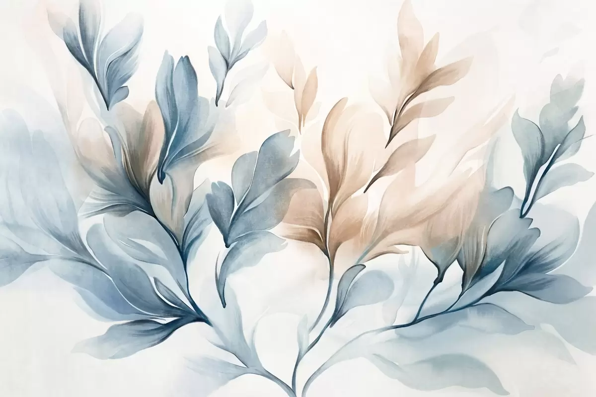 Фотошпалери Синє та коричневе абстрактне листя з видимими мазками пензля, легке та фактурне, м'яка кольорова палітра, ефект акварелі w09313