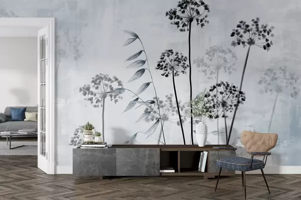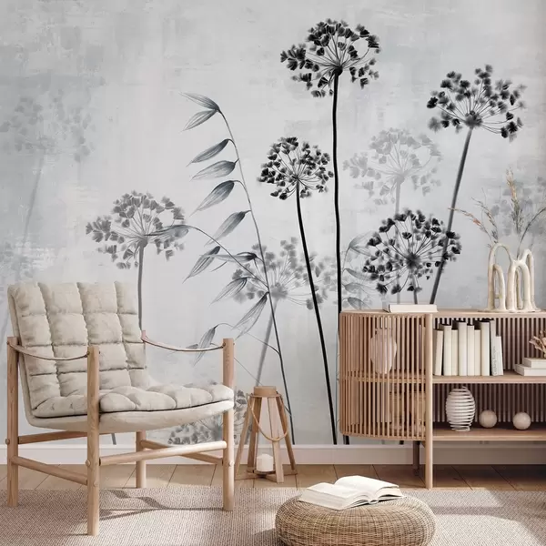 Фотошпалери Малюнок сухоцвітів з довгими стеблами, монохромна палітра, на фактурному світло-сірому тлі, ботанічна ілюстрація w09314
