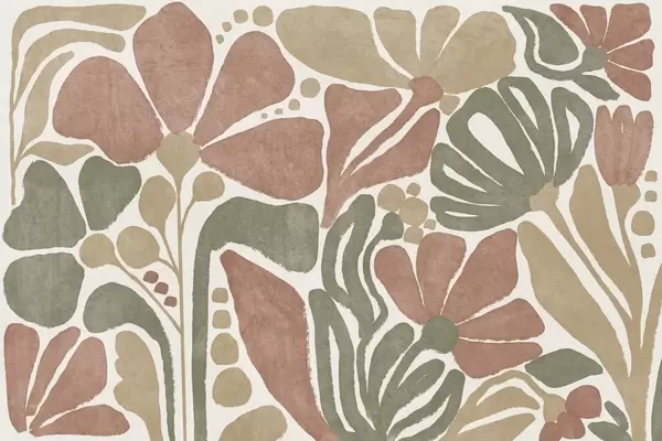 Фотошпалери Абстрактні квіти у відтінках червоного, зеленого та бежевого, на світлому тлі, у пласкому, стилізованому сучасному мінімалістичному дизайні w09315