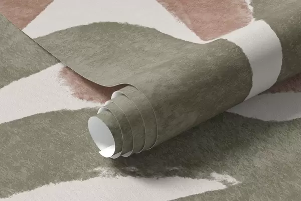 Шпалери Абстрактні квіти у відтінках червоного, зеленого та бежевого, на світлому тлі, у пласкому, стилізованому сучасному мінімалістичному дизайні w09315