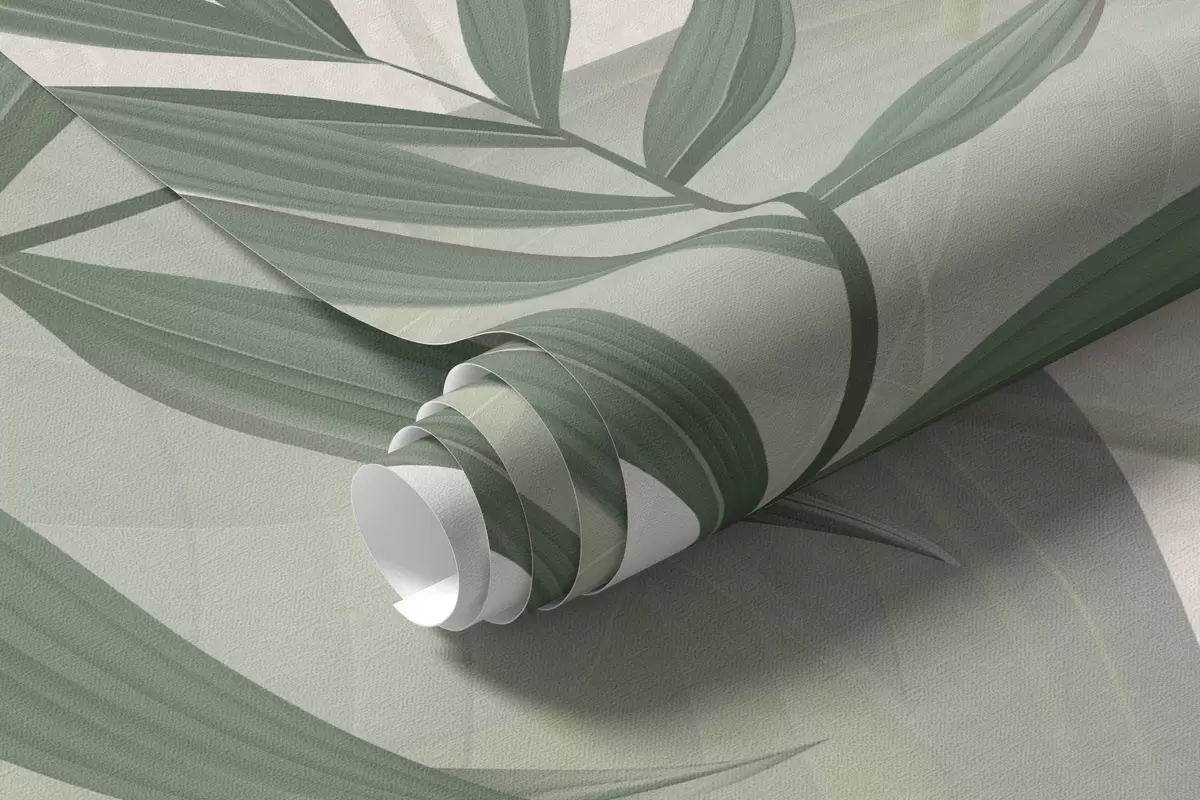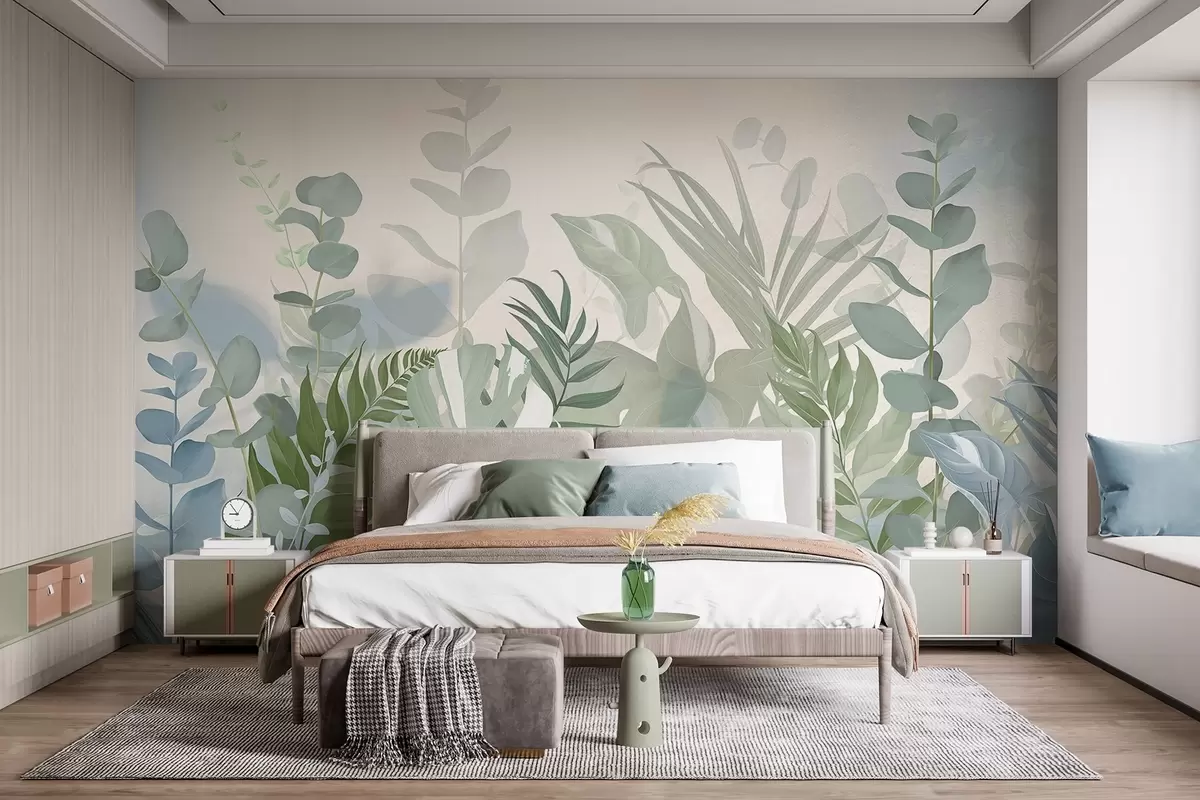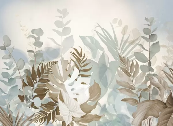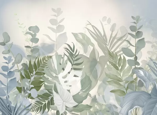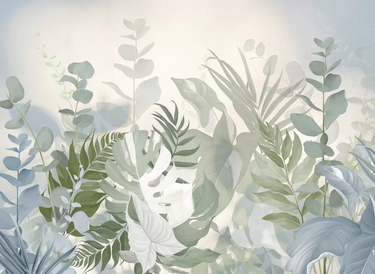 Фотошпалери Пастельно-зелені рослини папороті, монстери та евкаліпта, світлий текстурований фон, м'яке освітлення, спокійна, ботанічна ілюстрація w09316