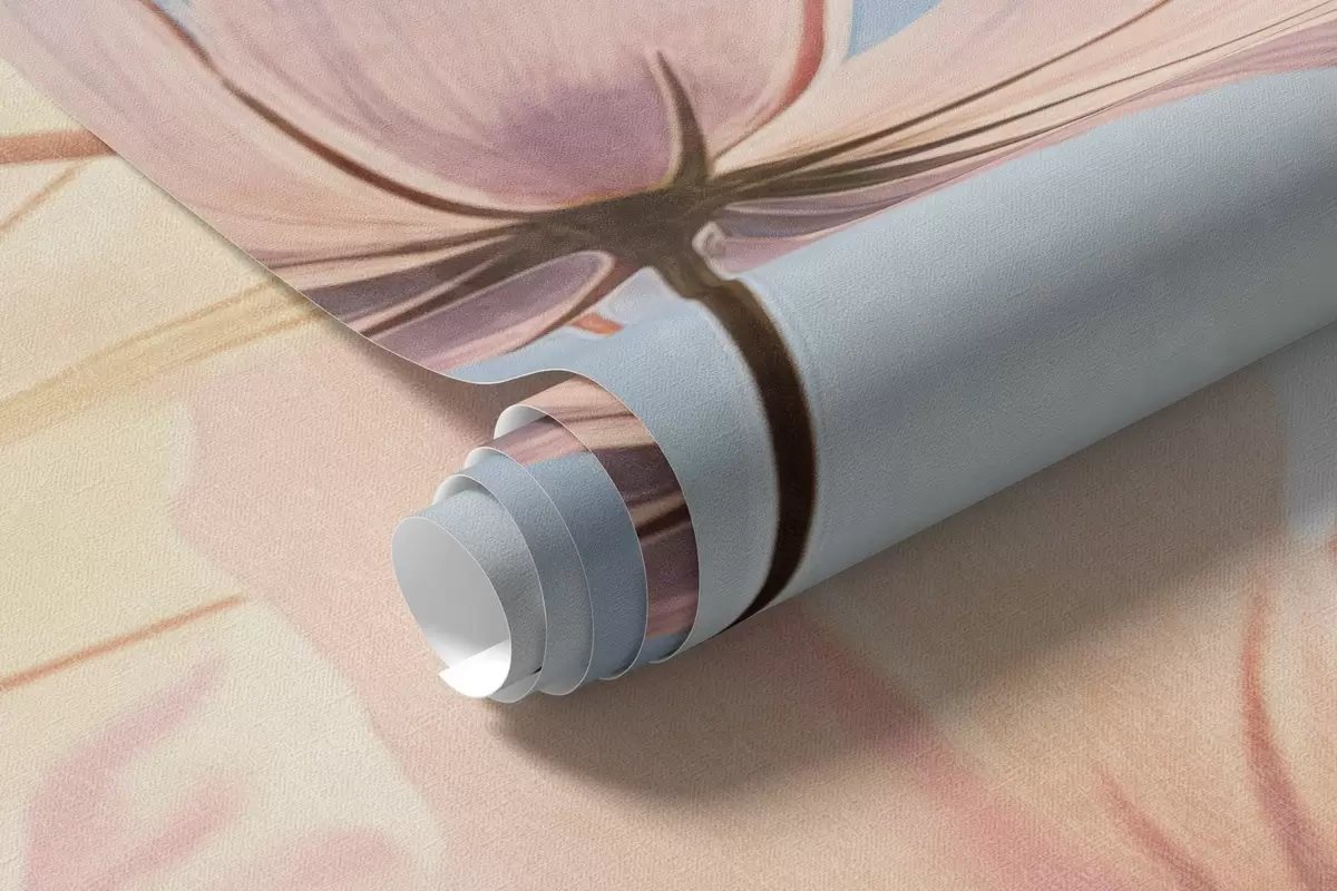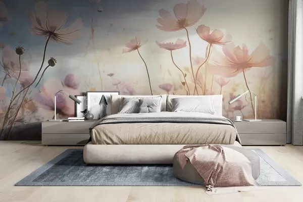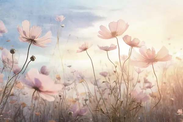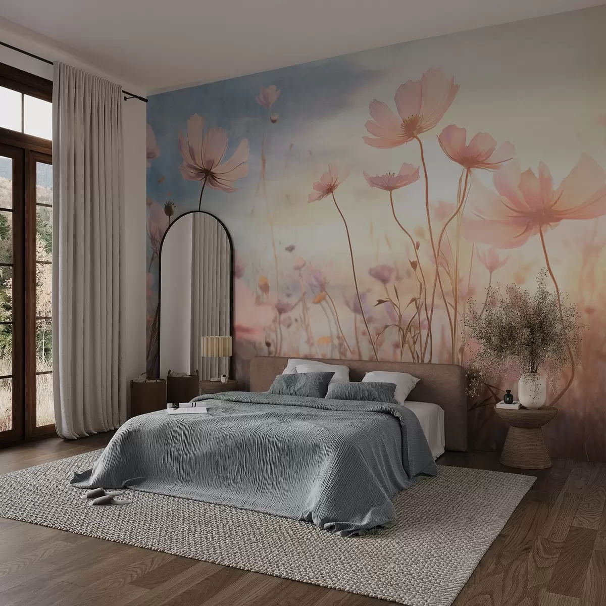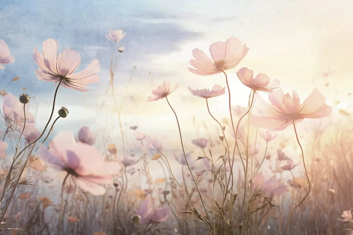 Фотошпалери Поле рожевих фактурних квітів з довгими стеблами на тлі м'якого блакитно-жовтого неба створює мрійливу атмосферу w09320