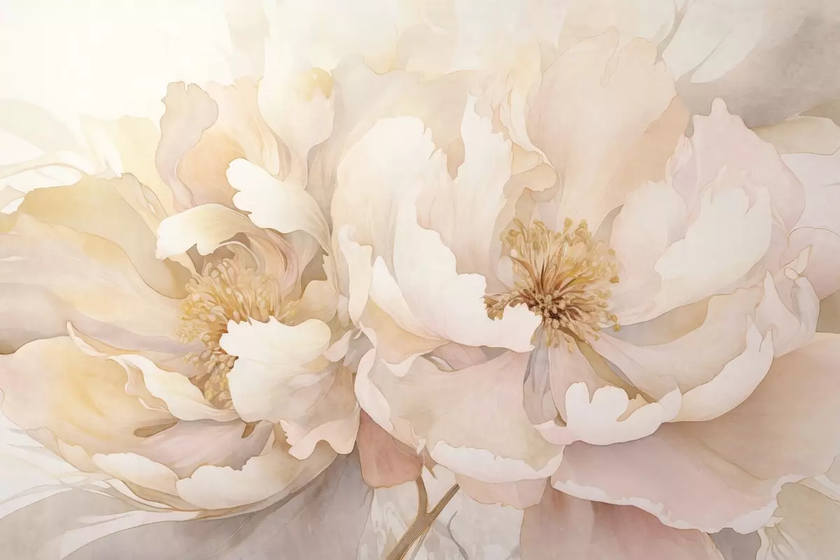 Фотошпалери Піоновидні фактурні квіти з ніжними пелюстками у відтінках кремового персика та світло-рожевого з м'якою, схожою на акварель, текстурою w09321