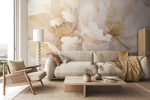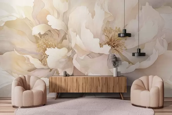 Фотошпалери Піоновидні фактурні квіти з ніжними пелюстками у відтінках кремового персика та світло-рожевого з м'якою, схожою на акварель, текстурою w09321