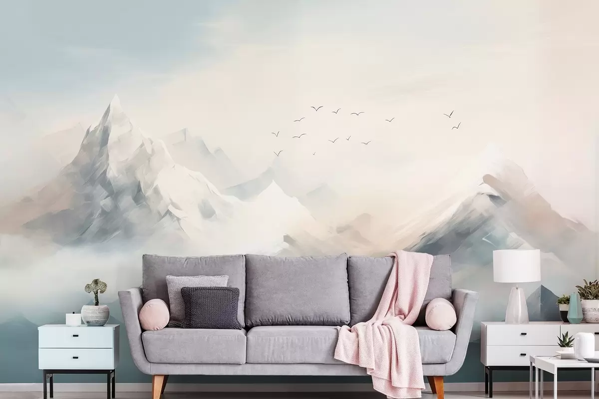 Фотошпалери Засніжені гірські вершини в ранковому тумані з птахами в польоті w09326