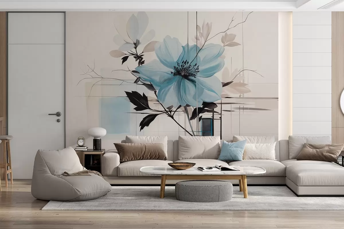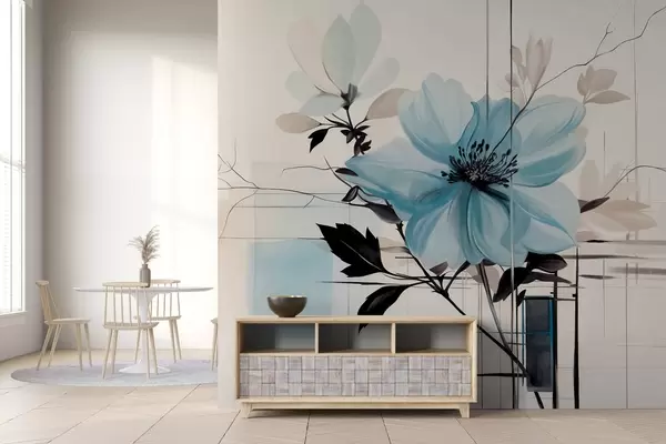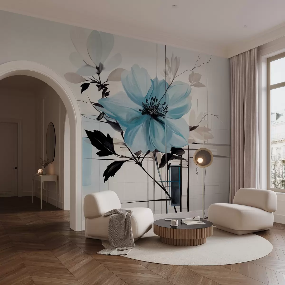 Фотошпалери Абстрактна фактурна синя квітка з темним листям і гілками, геометричні мінімалістичні форми і лінії в приглушених кольорах w09332