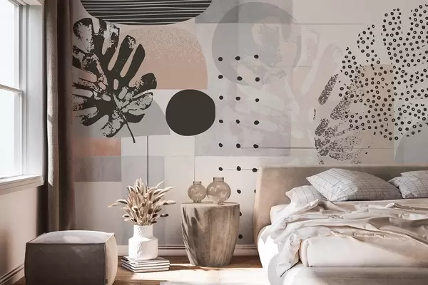 Фотошпалери Абстрактний принт з геометричними фігурами та тропічним листям монстери, колами, крапками та лініями, сучасний та мінімалістичний дизайн w09333