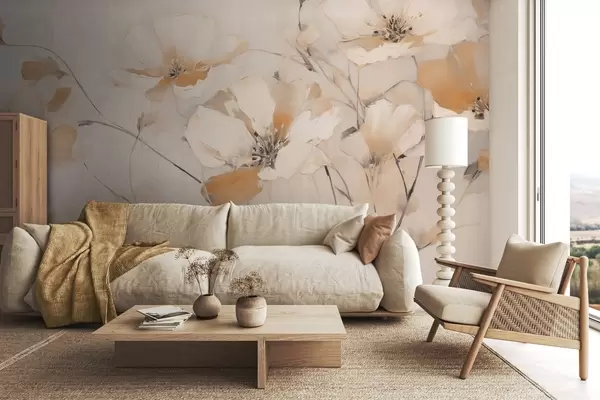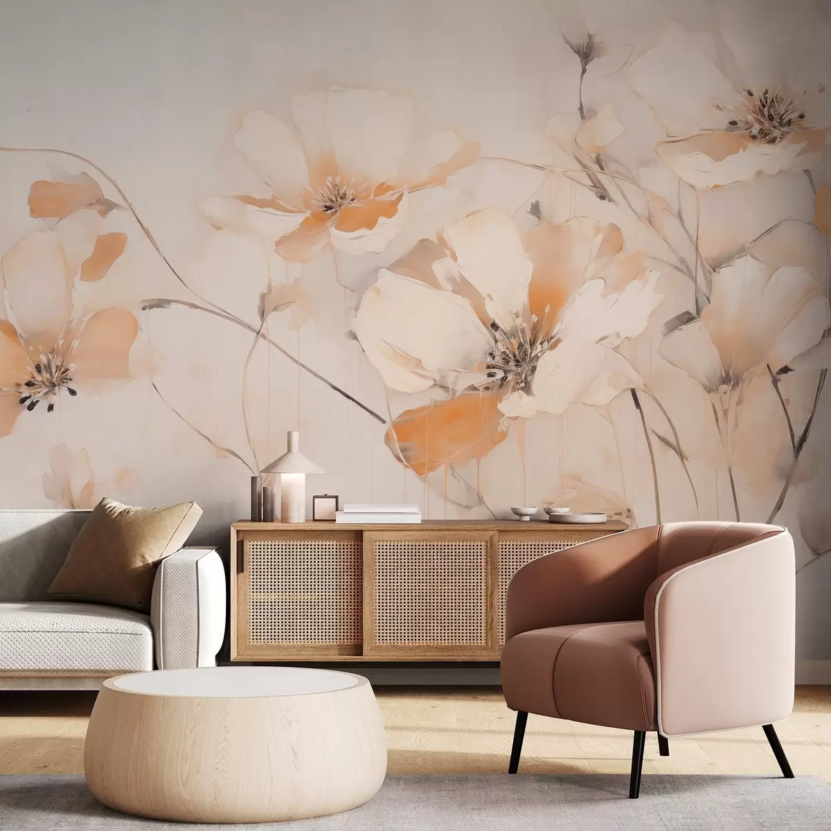 Фотошпалери Біло-помаранчеві фактурні квіти з довгими стеблами, світле тло, м'які кольори, елегантна композиція, ніжні мазки w09335