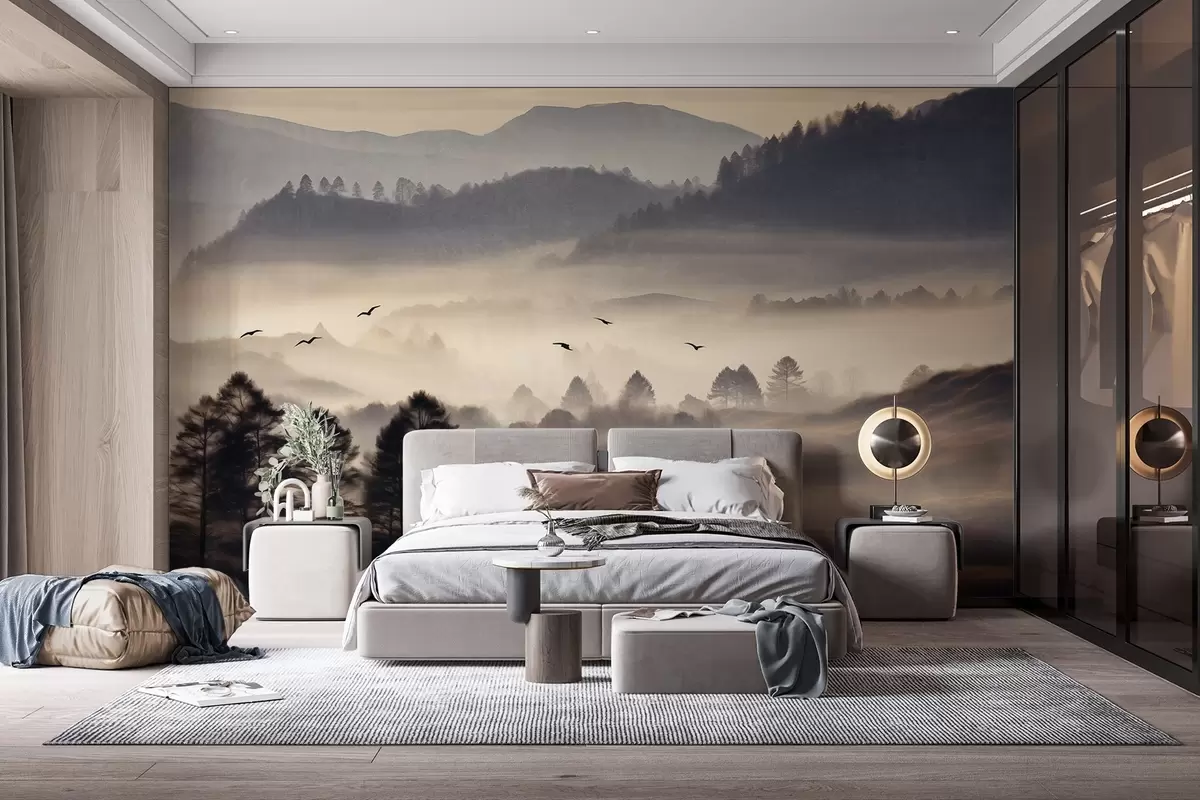 Фотошпалери Текстурований гірський пейзаж з шарами туману, силуети дерев на передньому плані, далекий гірський хребет, м'яке освітлення w09338