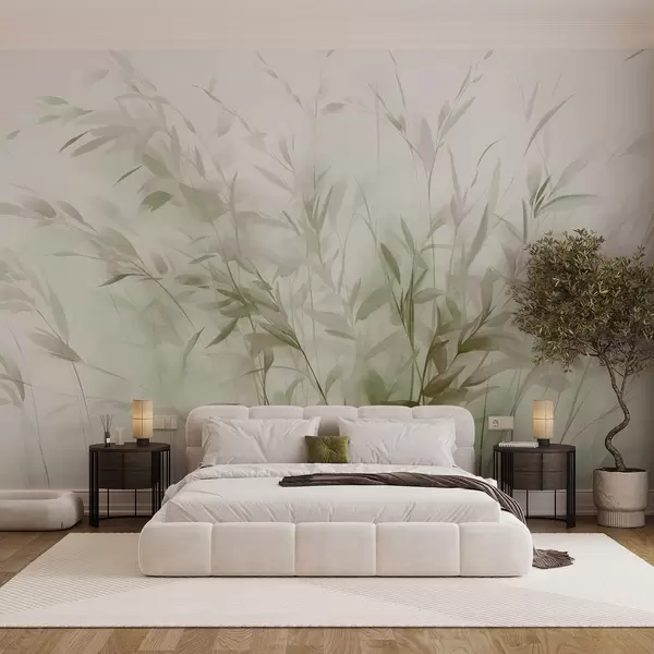 Фотошпалери Трава та бур'яни з тонким листям і стеблами, світло-зелені та коричневі кольори, м'які та делікатні мазки, мінімалістичний принт w09342