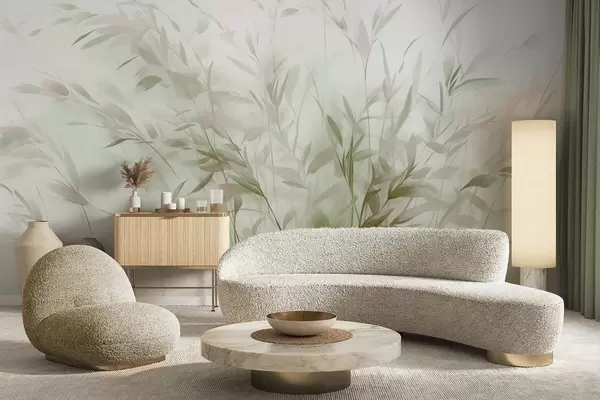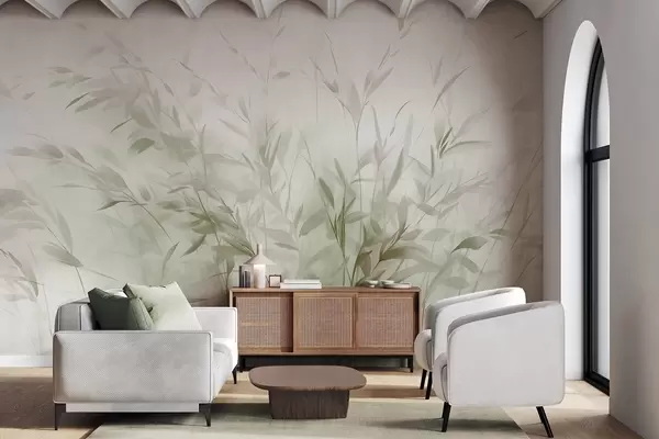 Фотошпалери Трава та бур'яни з тонким листям і стеблами, світло-зелені та коричневі кольори, м'які та делікатні мазки, мінімалістичний принт w09342
