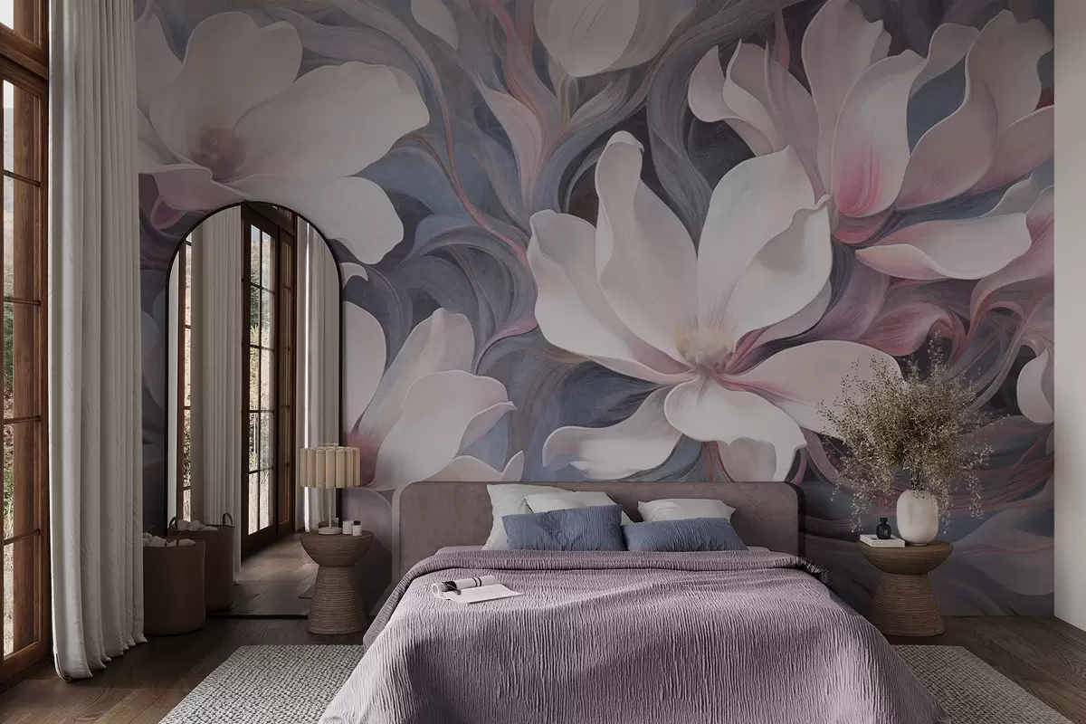 Фотошпалери Фактурний живопис білих квітів магнолії з рожевими акцентами на тлі закручених, приглушених синіх і сірих тонів w09344