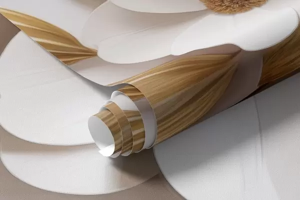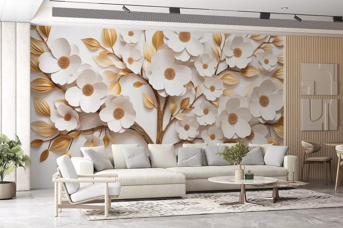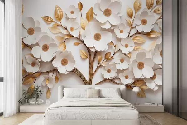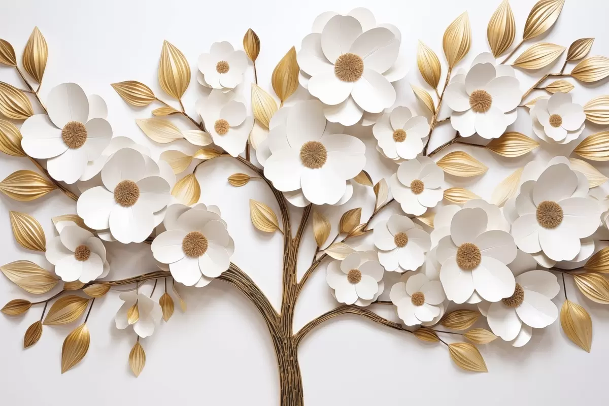 Фотошпалери Дерево з білими квітами та імітацією рельєфного листя w09348
