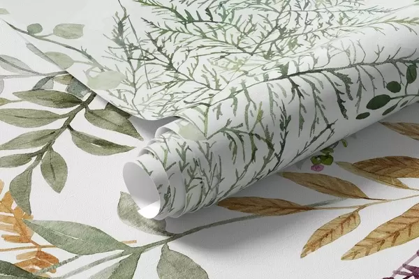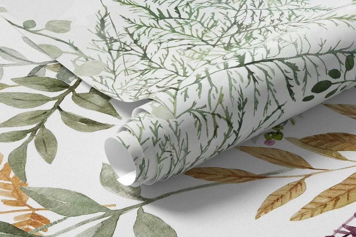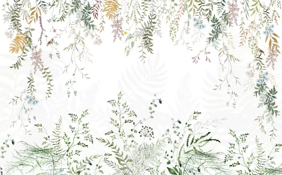 Фотошпалери Ботанічна ілюстрація з папороттю, травою та висячими рослинами, пастельні тони, на білому тлі, акварельний фактурний стиль w09364